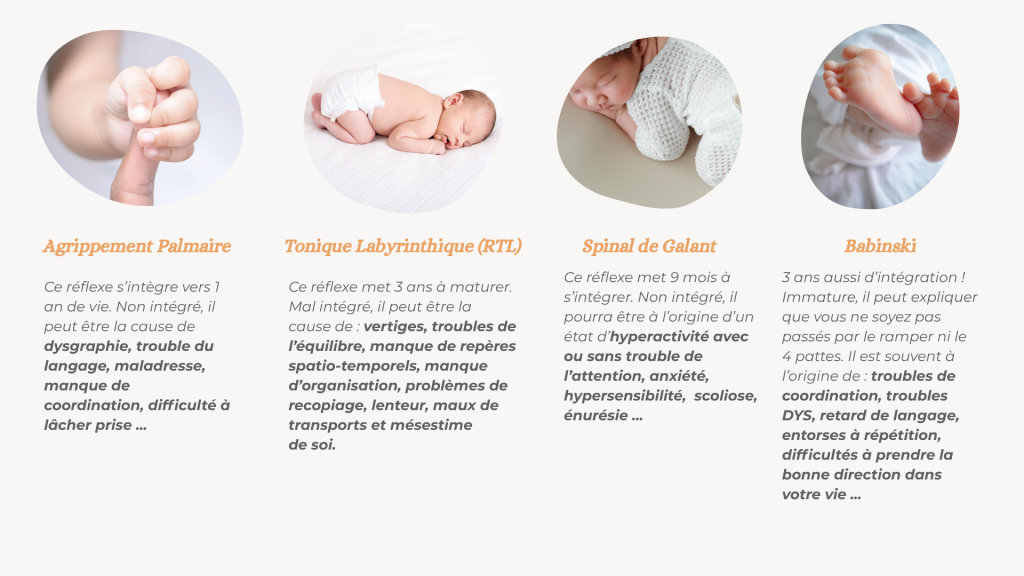 Il arrive qu’un réflexe s’intègre mal, voire pas du tout. Difficultés lors de la grossesse ou à l’accouchement, manque de motricité libre dans l’enfance, passage trop rapide des étapes motrices, matériel de puériculture (cosy confort, trotteur…), traumatisme physique, choc émotionnel, stress … nombreuses sont les raisons pour lesquelles un réflexe persiste ou réémerge.